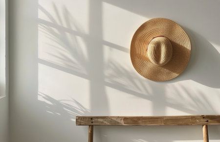 A straw hat hangs on a white wall with sunlight casting shadows.