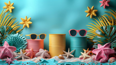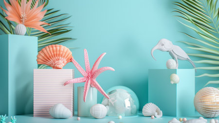 A vibrant composition of tropical-themed decor including shells, starfish, and palm leaves, displayed on a turquoise background, evoking summer and seaside vibes.