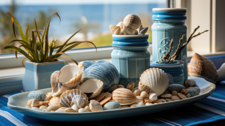 Decorated seashells on a blue plate with sea background