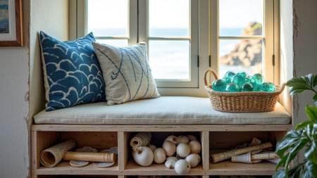 Cozy window seat with nautical cushions and ocean view in a bright coastal room.