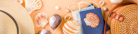 Optimistic coronavirus vacation concept. Summer 2020 vacation and travel background with medical mask, passports, airplane tickets and travel symbols flat lay. Waiting spring/summer time
