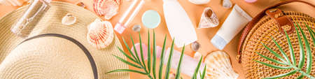 Summer cosmetics background. Summer skincare, sunscreen cosmetics, travel kit miniatures flat lay. Trendy peach background, with women bag, sea shells, tropical leaves, straw hat. Copy space above