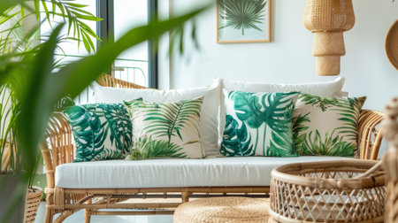 a white sofa adorned with green tropical-themed cushions Coastal interior design of living room AI generated