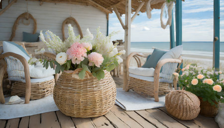 Wicker basket with flowers on the terrace of a beach house