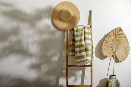 Organic linen beach towel on wood ladder, straw hat and dried palm leaf against white wall with shadows from tree leafes