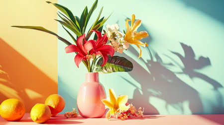 A bright and cheerful composition of colorful flowers in a vase against a vibrant backdrop of mint green and yellow. The shadows cast on the wall add depth and visual interest.
