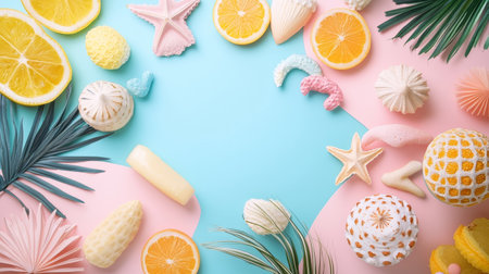Vibrant tropical flat lay with citrus slices, seashells, and palm leaves arranged on a pastel blue and pink background.