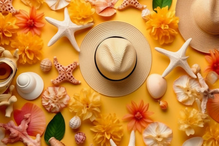 Summer beach design concept. Top view of holiday travel with shells, hat, slipper on yellow background.