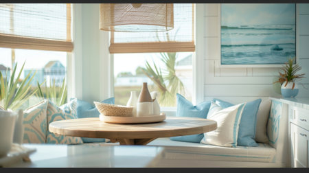 A cozy and inviting beach house kitchen complete with a breakfast nook bathed in natural sunlight coastal artwork and soft beachy hues
