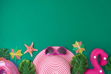 Summer vacation concept with beach hat, sunglasses, tropical leaves and flamingo decoration on green background. Top view, flat lay