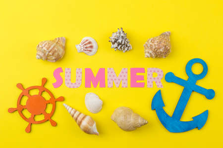 Inscription summer from paper of multi-colored letters and seashells on a bright yellow background. Summer relaxation. vacation.