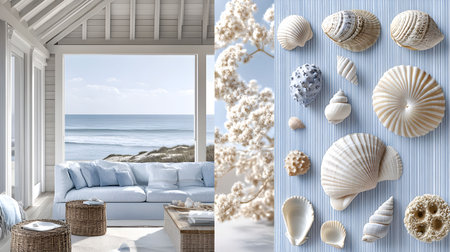 Coastal style interior mood board. Soft blue tones and natural textures create calming atmosphere in a coastal living area. Large windows frame a breathtaking ocean view