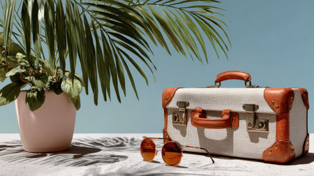 A stylish vintage suitcase with leather accents sits next to a trendy pair of sunglasses and a potted plant, creating a chic vacation vibe.