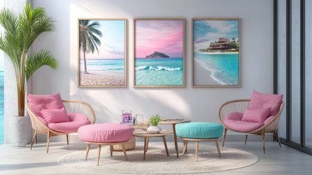 Bright and inviting coastal living room featuring stylish pink accent chairs and tropical artwork, creating a serene and relaxing atmosphere perfect for unwinding.