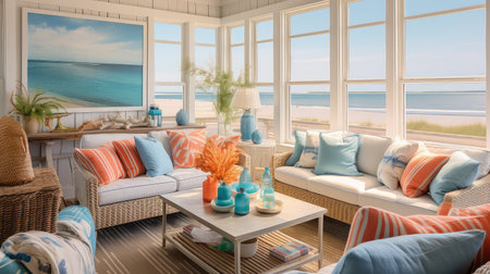 serene beach house interior design illustration breezy oceanic, seaside relaxed, bright natural serene beach house interior design