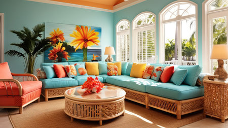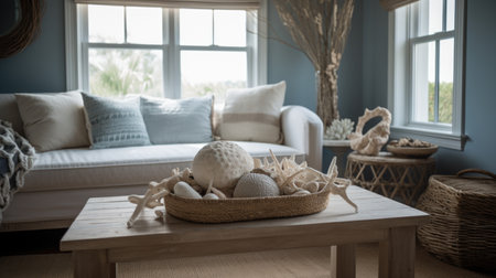 Interior design of Living Room in Coastal style with Ocean View decorated with Natural Fibers, Coastal Accents material. Coastal architecture. Generative AI AIG24.