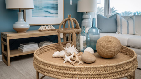 A circular wooden table adorned with aqua seashells and a picture of a beach scene. The combination of natural elements and coastal imagery creates a soothing and inviting atmosphere in the room AIG50