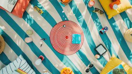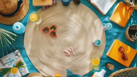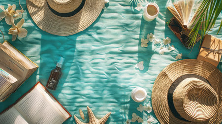 Beach essentials with a straw hat, sunglasses, and flip-flops. Summer vacation accessories on a patterned towel. Concept of travel, holiday, beachwear, and relaxation.