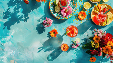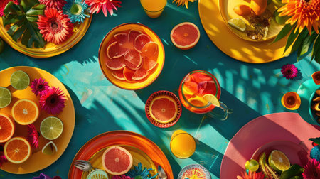 An intricate table setting with colorful dishware and drinks arranged in a circular pattern, resembling a painting of a vibrant aquatic organism AIG50