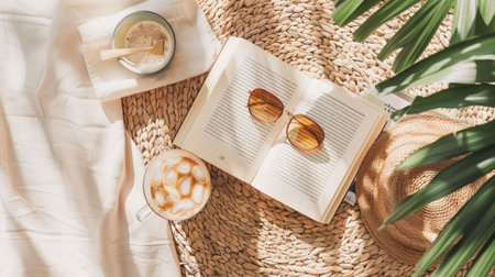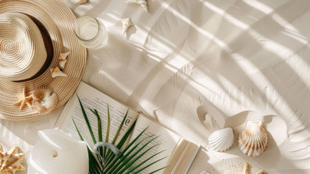 A beautiful beach landscape featuring a book, hat, starfish, seashells, and a refreshing drink by the aqua water. The perfect spot to relax and enjoy the sun AIG50