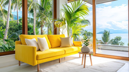 A stunning modern living room featuring a bright yellow sofa surrounded by large windows. The tropical scenery invites relaxation and comfort, showcasing stylish decor and abundant greenery.