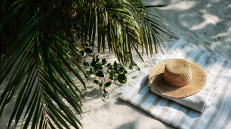 A beach towel and straw hat laid out under a palm tree, tropical paradise vibes