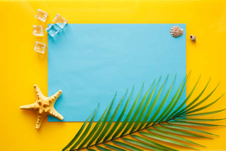 Tropical palm leaf, ice cubes, sea starfish, minimal summer concept, work motivation. escape from the office, integration trip, yellow background, blue card with an empty space for text. Flat