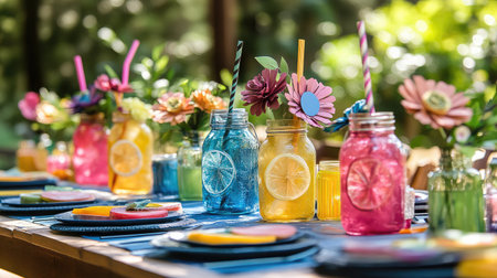 Garden party table featuring icy drinks in every color, decorated with paper flowers and fruit slices