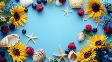 Sunflowers and assorted berries are arranged artfully around seashells and starfish on a soft blue backdrop. The composition highlights a cheerful, coastal vibe perfect for summer.
