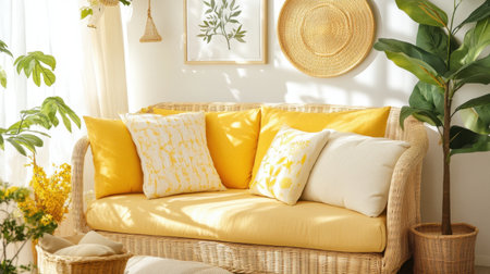 A bright and inviting living room scene featuring a comfy sofa adorned with yellow cushions and surrounded by lush greenery, perfect for a stylish and cheerful atmosphere.
