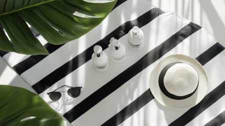 A serene summer scene displaying minimalist skincare products on a stylish striped fabric, accompanied by sunglasses and a sunhat, framed by tropical leaves and soft shadows for a relaxed vibe.
