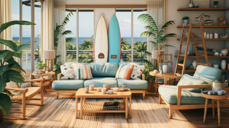 Interior of a bright living room with a surfboard. Generative AI