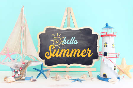 Blackboard with Summer time chalk text, with sea shells, rope and star fish on light wooden background