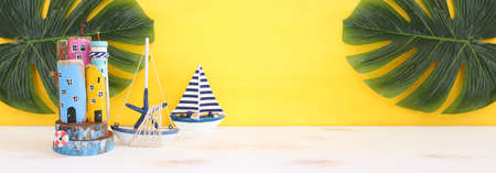 Nautical concept with sea life style objects as boat, driftwood beach houses, seashells and starfish over wooden table and yellow background