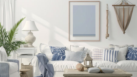 Mock up frame in home interior background coastal style living room with marine decor