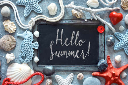 Blackboard with sea shells, stones, rope and star fish on textured light blue background, text Hello Summer in chalk