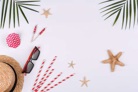 Beach accessories: glasses and hat with shells and sea stars on a white background. Summer background