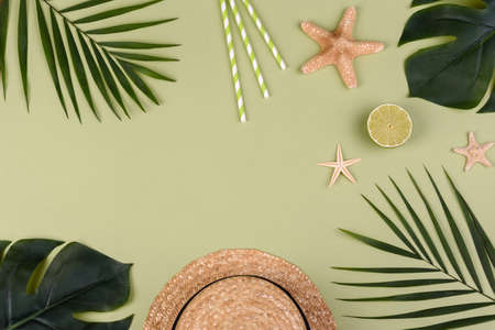 composition of a palm leaf with starfish on the light green background, summer vacation concept, top view, copy space