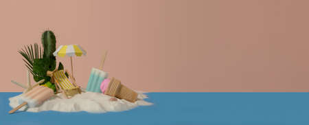 3d render minimal podium background for show and sales products. Hello Summer season scene design concept. Abstract Vacant pedestal for presentation and advertising. Beach Vacations in Summer.