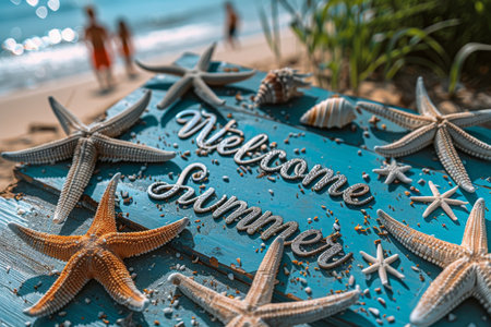 A sunny beach with stars and summer vacation items . postcard. The inscription on the postcard is welcome, summer.