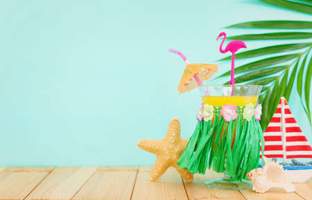 Summer concept with green leave, starfish and lifebuoy decoration on wooden background