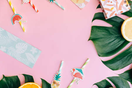 Flat Lay Summer tropical background. Workspace with supplies and fresh fruits. Top view, copy space