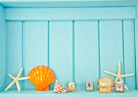 summer background: photo frame, starfish, seashells on a blue wooden background