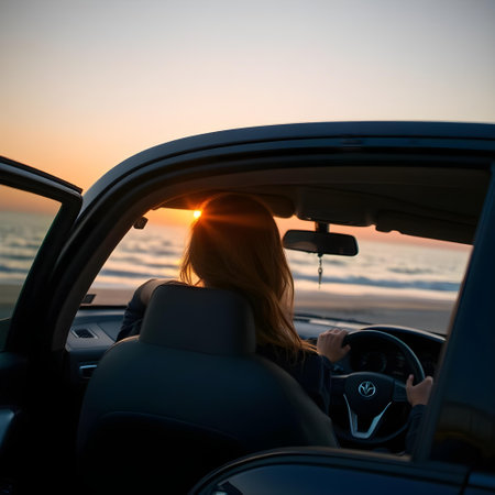 Young woman driving convertible car on the beach at sunset, rear view