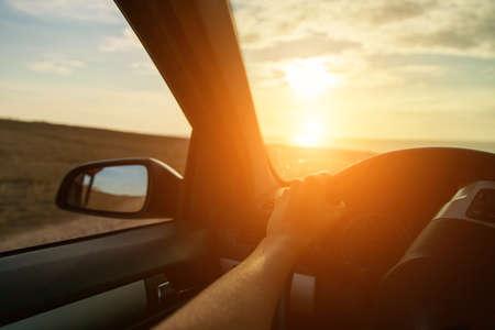 man driving a car at sunset-dawn, close-up, blur. Concept, road trips and travel, freedom of movement.
