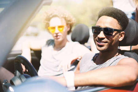 Young friends in cabriolet car ready to vacation