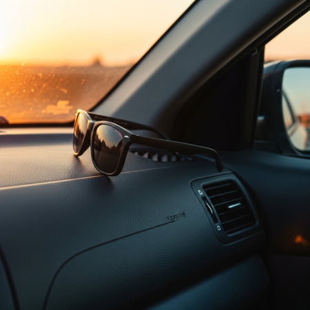 Sunglasses on the driver's seat of a car at sunset
