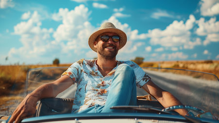 A fashionable and stylish man enjoys a leisurely drive along a scenic country road surrounded by beauty. Generative AI