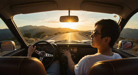 Young asian man driving a car on the road at sunset.