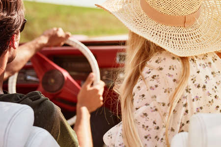 back view couple going road trip. High quality photo